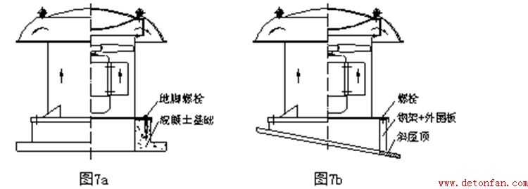 ④對于平頂式屋頂可采用混凝土基礎安裝(圖7a);對于尖頂式屋頂(斜屋面)可采用鋼架結構安裝(圖7b)。為避免漏風,可在風機機座與安裝基礎之間墊厚橡膠皮。