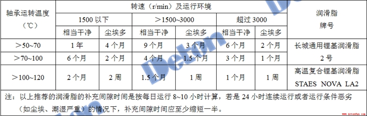 ②應(yīng)定期補(bǔ)充潤滑脂,其牌號及補(bǔ)充間隙時間可參考(圖1)的推薦。