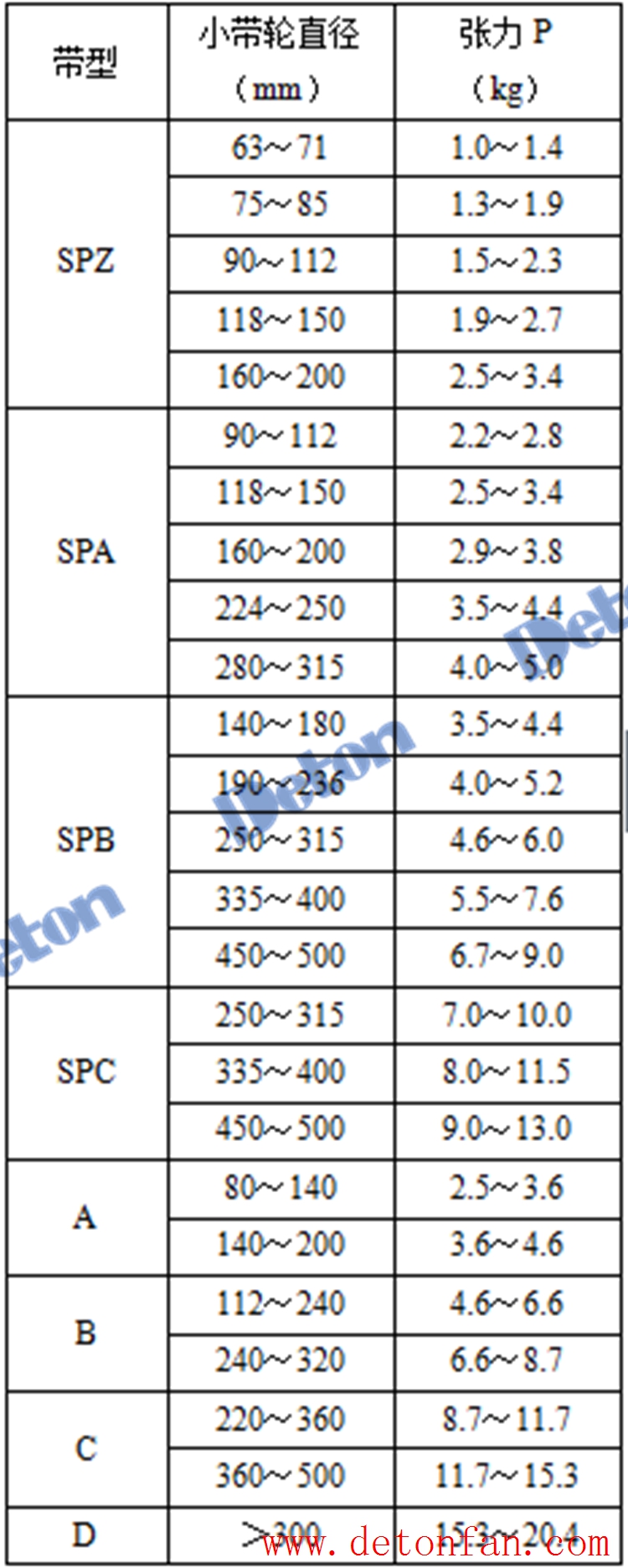 ②三角皮帶運轉(zhuǎn)開始后24小時內(nèi),其伸長量可達(dá)膠帶總伸長量的80%~90%(初期拉伸),因此皮帶張緊力調(diào)整周期建議按(表1)所示: