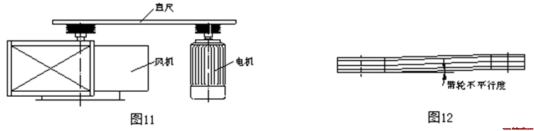 ⑦更換帶輪或風(fēng)機(jī)檢修后,應(yīng)進(jìn)行主軸帶輪和電機(jī)帶輪之間的找正。如(圖4)所示,把直尺置于兩個帶輪的外側(cè)端面上,將兩輪端面調(diào)整到在同一平面上為止;帶輪的不平行度應(yīng)控制在1/3°以內(nèi)(圖5),否則會引起三角皮帶單邊磨損,使用壽命顯著降低。